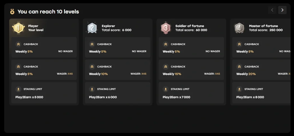 | Intermedio | Aumento del cashback, giros gratis semanales y ofertas especiales. |